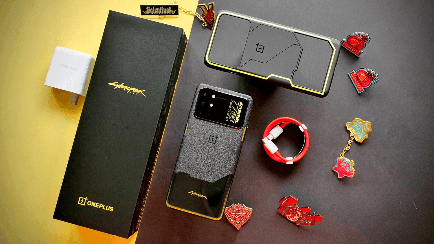 Este OnePlus 8T Cyberpunk 2077 es una pieza bastante única y que cuenta con el mismo hardware que un OnePlus 8T normal de 12 GB de RAM y 256 GB de almacenamiento. En la caja del terminal se incluye una funda brillante en la oscuridad y pegatinas especiales y varios pines del juego con una calidad increíble.