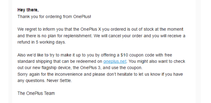 Al parecer, la noticia viene de que hay gente intentando comprar el OnePlus X y la compañía china está devolviendo los pagos y enviando un correo a los compradores diciendo que no hay stock ya de ese terminal. Y según se puede leer no tienen intenciones a corto plazo de renovarlo. Parece ser que el OnePlus X ya no se podrá comprar a partir de ahora. Es una pena ya que ofrecía un buen terminal a un precio bastante competitivo y con un diseño muy cuidado. Este terminal no ha durado ni 1 año en el mercado y OnePlus ya lo ha retirado.