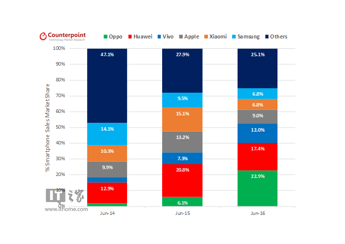 El desarrollo firme y decidido de OPPO ha conseguido desbancar el éxito de otras marcas como Xiaomi que el año pasado conseguía un 15% y este año se ha reducido en casi 10 puntos, llegando al 6,8%. En este año OPPO ha conseguido un 22,9% frente al 6,1% conseguido en esta fecha en el año pasado.