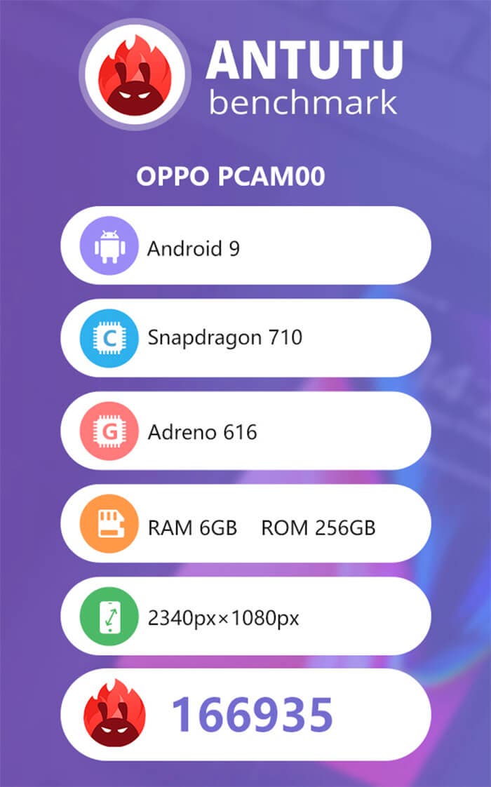 Sobre sus características, si hablamos primero de lo que vemos en AnTuTu, el procesador de este terminal apodado como PCAM00 será el Qualcomm Snapdragon 710 junto a 6 GB de memoria RAM y 256 GB de almacenamiento interno. Este procesador ya pudimos probarlo en el Oppo RX17 Pro y la verdad es que nos gustó mucho. Sobre la GPU, es la Adreno 616. AnTuTu también nos deja ver la resolución de su pantalla, 2.340 x 1.080 píxeles, lo que viene a ser FullHD+.