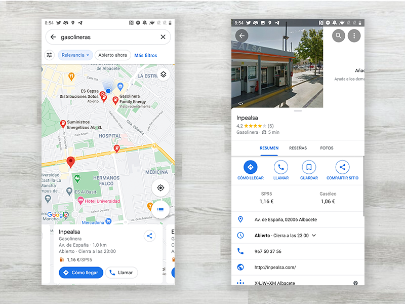 Al momento de seleccionar una tarjeta de una gasolinera te mostrará información, los botones de cómo llegar y también el precio de la gasolina sin plomo 95. Si pulsas sobre la tarjeta del negocio podrás ver el resto de precios de los diferentes combustibles que ofrecen en esa gasolinera.