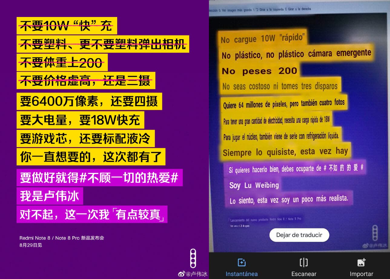 Todavía no sabemos si la información que os traemos ahora pertenece al Redmi Note 8 o al Note 8 Pro. La verdad es que le encontramos más sentido a que sea la versión Pro, como ahora veremos, aunque no podemos negar que nos gustaría ver estas características en el modelo normal. La imagen que han publicado está en perfecto chino, pero con ayuda del traductor de Google hemos podido entender lo que nos dice. Os dejamos una captura de pantalla de la traducción junto con la imagen original.