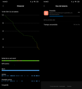 Tras unos 10 períodos completos de batería, podemos concluir que esperábamos algo mejor. Xiaomi siempre ha cumplido con la autonomía de sus Redmi Note, pero este Redmi Note 8T queda por debajo de nuestras expectativas. En todos los ciclos hemos realizado más o menos el mismo uso, con unas 30 horas del teléfono encendido (un día y 6 horas) y unas 5:30-6:00 horas de pantalla activa. Es una autonomía que a la gran mayoría de usuarios le permitirá llegar a final del día sin problemas, pero los usuarios más exigentes verán como necesitan una recarga para llegar a la noche.