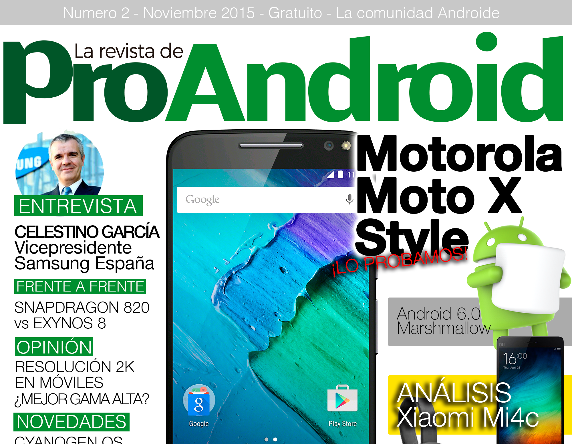 Ya ha pasado un mes desde que lanzamos el primer número de ‘La Revista de ProAndroid’, y ya tenemos sobre la mesa el segundo número correspondiente al mes de Noviembre de 2015. Mucho contenido que leer, novedades, opinión, curiosidades… Y una entrevista a Celestino García, Vicepresidente de Samsung España. Por supuesto, este número cuenta con un nuevo sorteo de un smartphone muy de moda, y que comenzará a partir del próximo 21 de noviembre. ¡Descárgate la revista ya en el siguiente enlace!