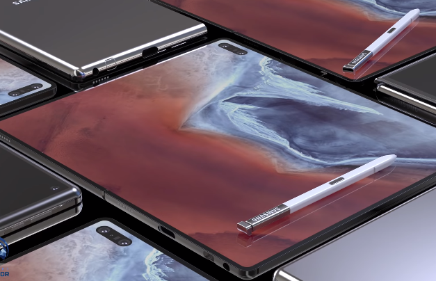 A partir de este diseño, Concept Creator deja a un lado el gigantesco notch del terminal para acabr sustituyéndolo por una incisión muy parecida a la del Galaxy S10+ en la que se integra una doble cámara acompañada de un sensor frontal. De esta forma se aprovecha al máximo el espacio útil de una pantalla que va de borde a borde, por lo que también aumentan las dimensiones del panel actual de 4,7 pulgadas con la añadidura de otro agujero en pantalla. Esta vez muy similar al del Galaxy S10. Sin olvidarnos de la integración de un S Pen que se muestra como un accesorio bastante lógico de utilizar cuando el dispositivo se encuentra completamente desplegado.