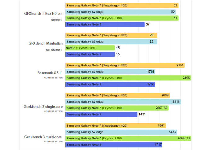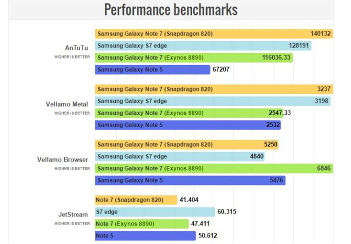 La noticia que os traemos hoy es acerca de que móvil es mejor, si el Samsung Galaxy Note 7 con procesador Qualcomm, o el mismo móvil con el procesador propio de Samsung, Exynos. El Galaxy Note 7 lleva en Europa el último procesador de Samsung, el Exynos 8890, mientras que en otros países como Estados Unidos lleva el Qualcomm Snapdragon 820. Estas pruebas que os vamos a mostrar no son en vídeo, sino en imágenes, ya que son resultados de bastantes benchmarks en los que se somete a unas pruebas a ambos móviles para saber cual es mejor.