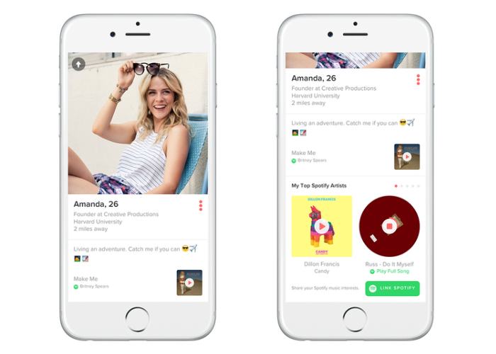 La música está en nuestro día a día y no podemos evadirnos de ella, a todo el mundo le gusta, a cada uno un estilo o quizás te guste todo tipo de música y esto es lo que Spotify sabe implementar, o mejor dicho vender. Han elegido la aplicación Tinder para integrar Spotify en ella, podremos poner en nuestro perfil nuestro estilo de música y con ello poder buscar perfiles que puedan gustarles tu música. También podemos reproducir nuestras canciones favoritas sin salir de Tinder, fácil y sencillo.