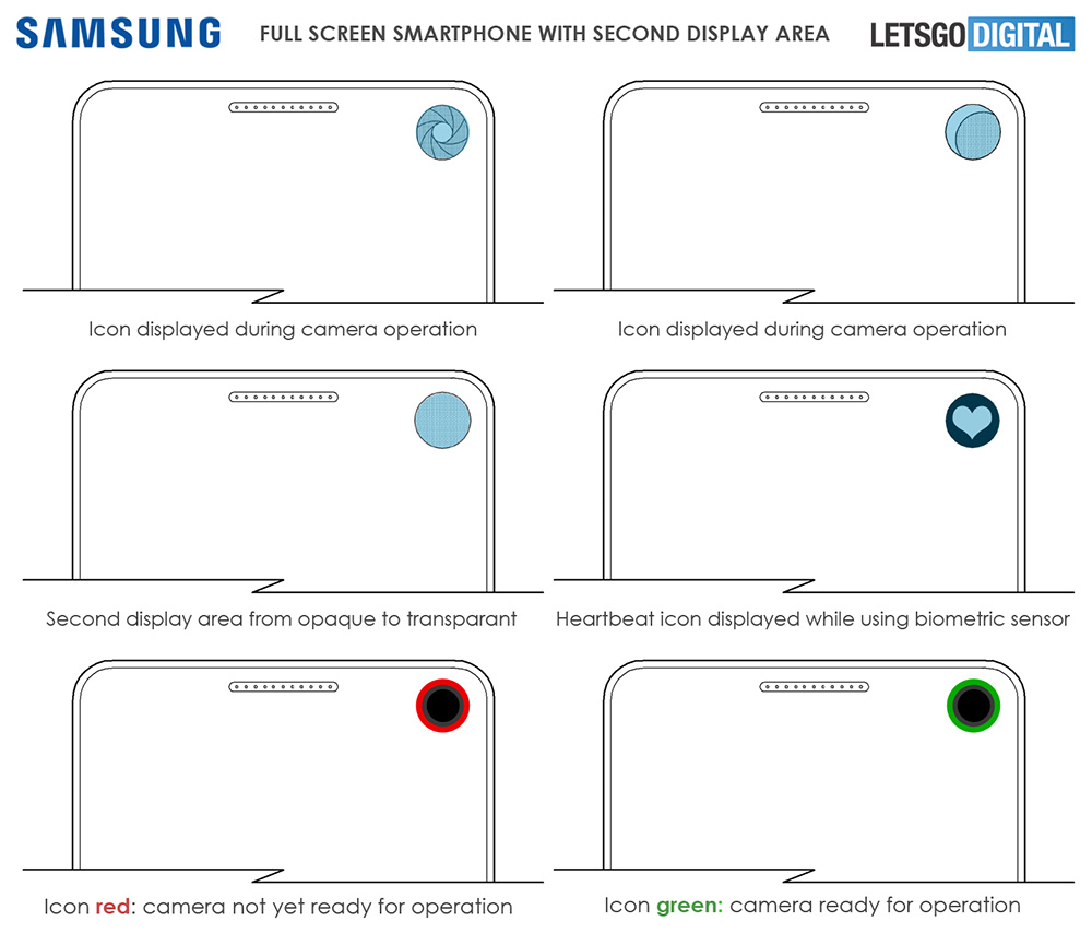 La idea de Samsung es colocar una pequeña pantalla transparente encima de la cámara para poder mostrar información cuando el sensor no esté activo. Esto ocurre la mayor parte del tiempo, por lo que el usuario podría tener información extra en ese punto de la pantalla. La patente simula algunas situaciones con diferentes iconos y animaciones, aunque por el momento desconocemos bien su funcionamiento.