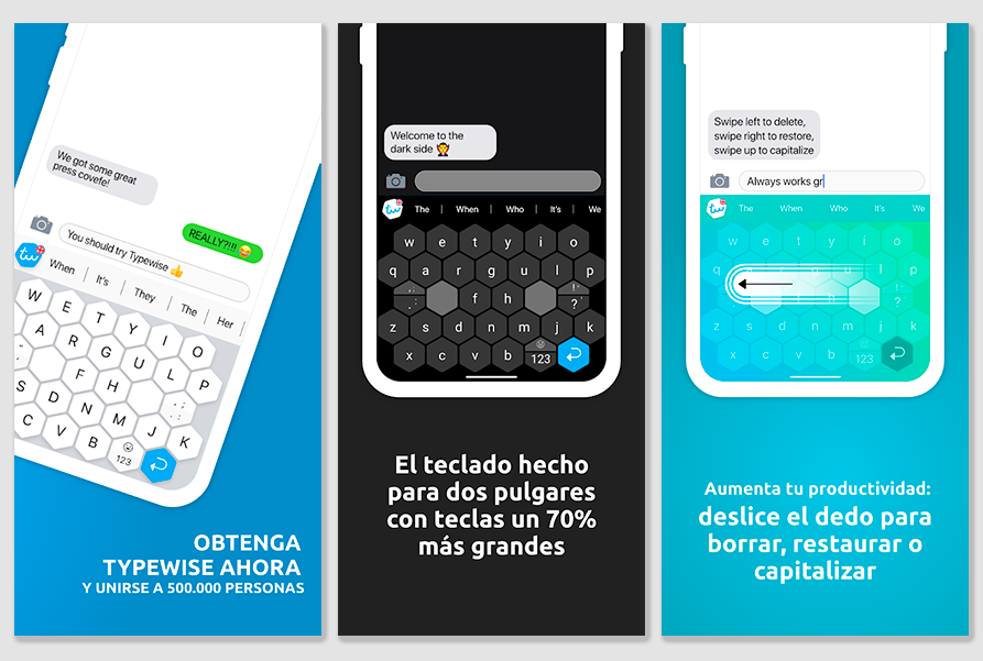 TypeWise no tiene este formato y diseño por gusto, según los diferentes estudios este diseño permite tener teclas más grandes y minimizar los errores a la hora de pulsar. También es un teclado más seguro de lo normal, pues cuenta con un modo 100% offline y no pide permisos sospechosos.