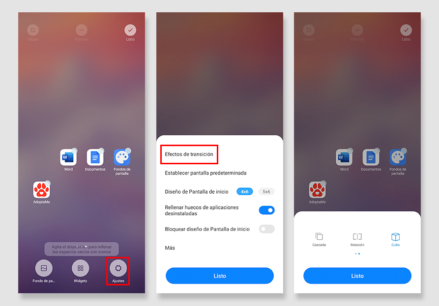 Con estos sencillos pasos podrás cambiar la transición de la pantalla de inicio cuando deslizas hacia un lado o hacia otro. Hay varios disponibles y la interfaz te permite ver cómo actúa cada uno antes de seleccionarlo.
