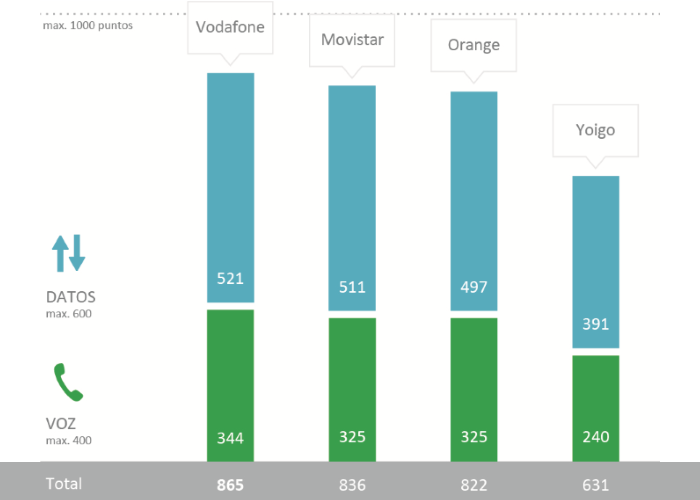 Se han examinado tanto datos como voz y en términos generales siempre ha ganado Vodafone y Yoigo ha estado por detrás de los tres líderes. En las poblaciones de menos de 100.000 habitantes ha ganado la calidad de voz de Movistar, siendo también Yoigo la que peor calidad ofrece.