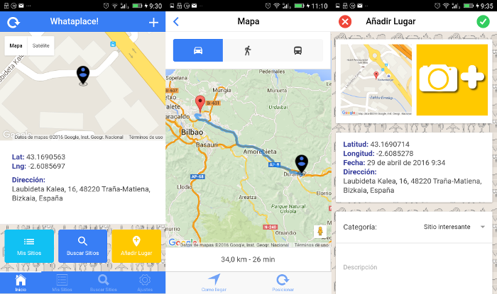 Con un solo gesto, la aplicación nos guarda automáticamente la ubicación y la añade a nuestra lista de sitios guardados, pero sus funciones no quedan ahí. Nos permite añadir una fotografía del lugar fácilmente, agruparlos en categorías o añadir un descripción más detallada. En otra sección de la aplicación, se muestran todos estos lugares que hemos guardado previamente y nos permite activar la navegación mediante Google Maps hasta ellos de velozmente.