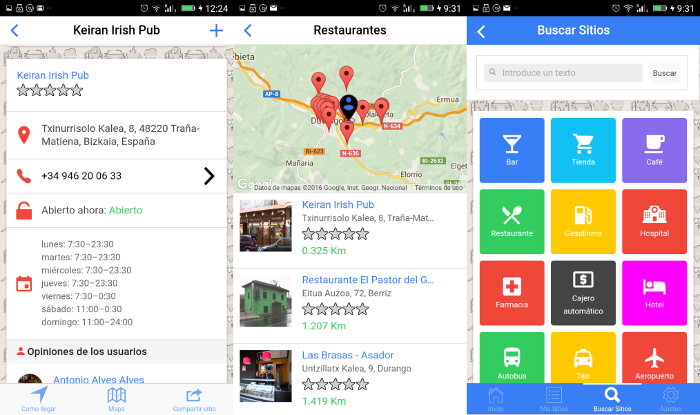 La otra parte de esta aplicación es la que nos ofrece la posibilidad de encontrar sitios de interés cercanos a nosotros, desde gasolineras, farmacias, restaurantes, cafeterías, hospitales, hoteles etc. Todo eso agrupado en una sola pestaña en la que podemos seleccionar la categoría rápidamente y se nos mostrarán de manera clara en el mapa. Para esta función, se basa en los datos obtenidos de Google Places, lo que le aporta numerosa información como números de teléfono, opiniones y horarios.