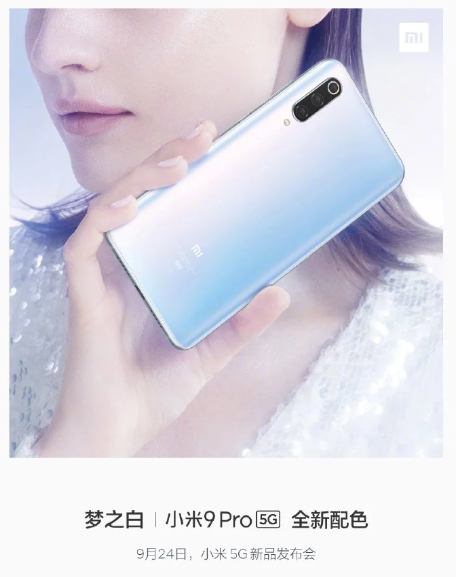 En segundo lugar, se muestra una imagen de la parte trasera en la que se puede apreciar que el nuevo Mi 9 Pro 5G llegará con una estética idéntica a la del modelo estándar. Nos encontramos con una triple cámara localizada en la esquina superior izquierda y un nuevo color Dream White exclusivo para esta versión.